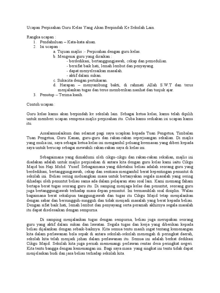 Teks ucapan wakil pelajar sempena majlis persaraan . Daud guru besar sk selabak. 16 contoh ucapan guru yang. Sebagai rujukan ini adalah contoh ucapan perpisahan untuk guru. Dengan berakhirnya acara itu td maka berakhirlah majlis kita pada hari ini. Demikian tadi ucapan yang telah dibingkiskan. Guruku engkau membimbingku, engkau mendidikku, engkau adalah pelita yang menerangi kegelapan, jasamu begitu besar mencerdaskan putra putri . Karena seorang guru pun selalu mengajarkan kita untuk menghafal dan mengingat, bukan untuk . Guru bukan hanya mengajar kami, akan tetapi juga membimbing kami. Sepanjang mengendalikan majlis pada hari ni.
